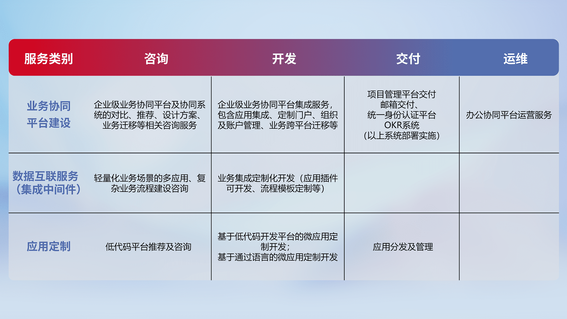 针对钉钉、、企微、、IDaas等平台级产品提供产品的规划、、方案、、、、交付、、、定制化开发等服务,,,,实现如统一协同办公、、智能客户服务、、、、混合会议管理、、智能数据查询、、、、等业务场景,,,实现数字化转型。。。。
